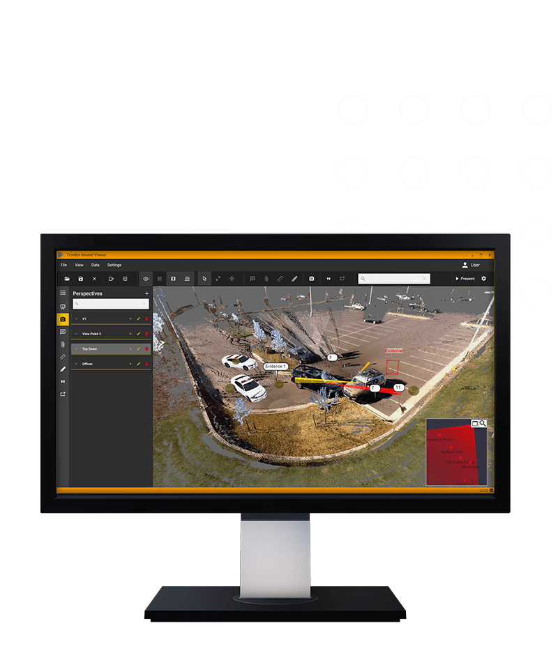 Trimble® Forensics Reveal office software is the ultimate solution for forensics diagramming. Use Reveal to analyze scene evidence, then create 2D and 3D diagrams and animations to tell the story of the events.